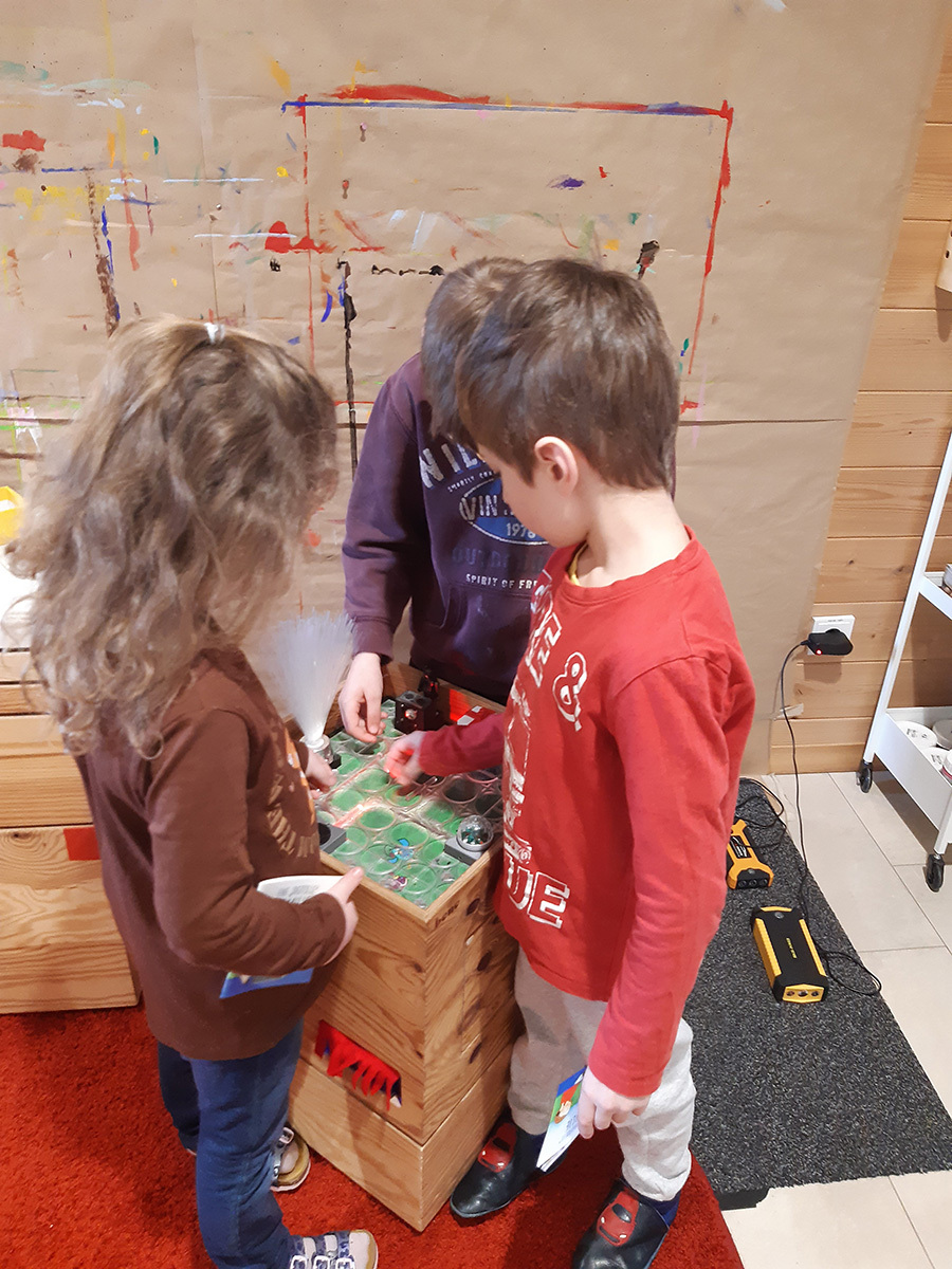 Glasfaser: Glas leitet Licht – Glasfasernetz – Informationsfluss; Verbindungen legen – Information leiten: An zwei Stationen konnte das Phänomen Glasfaser erforscht werden. Zum einen ging es um die grundlegende physikalische Wirkungsweise, dass Glas Licht leitet. Kinder konnten ihrer Kreativität freien Lauf lassen und ein Leuchtbild stecken. Wurden bei der zweiten Station stilisierte Glasfaserstücke richtig verlegt, konnten spannende Informationen übermittelt und Auswirkungen beobachtet werden.