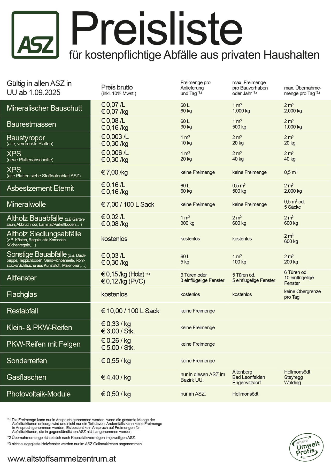 ASZ - Preisliste für kostenpflichtige Abfälle aus privaten Haushalten
