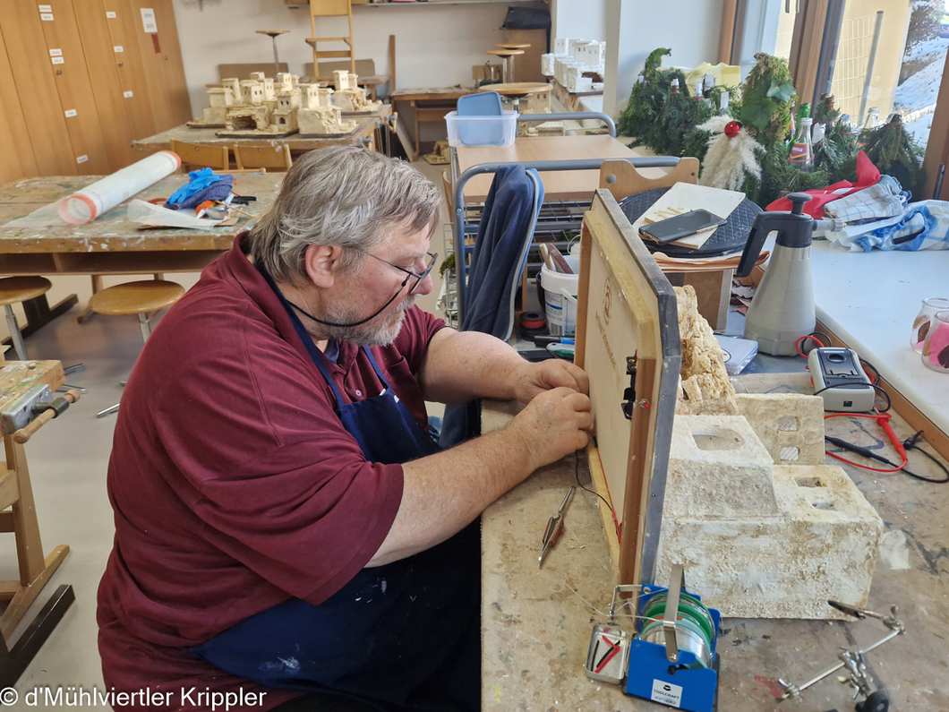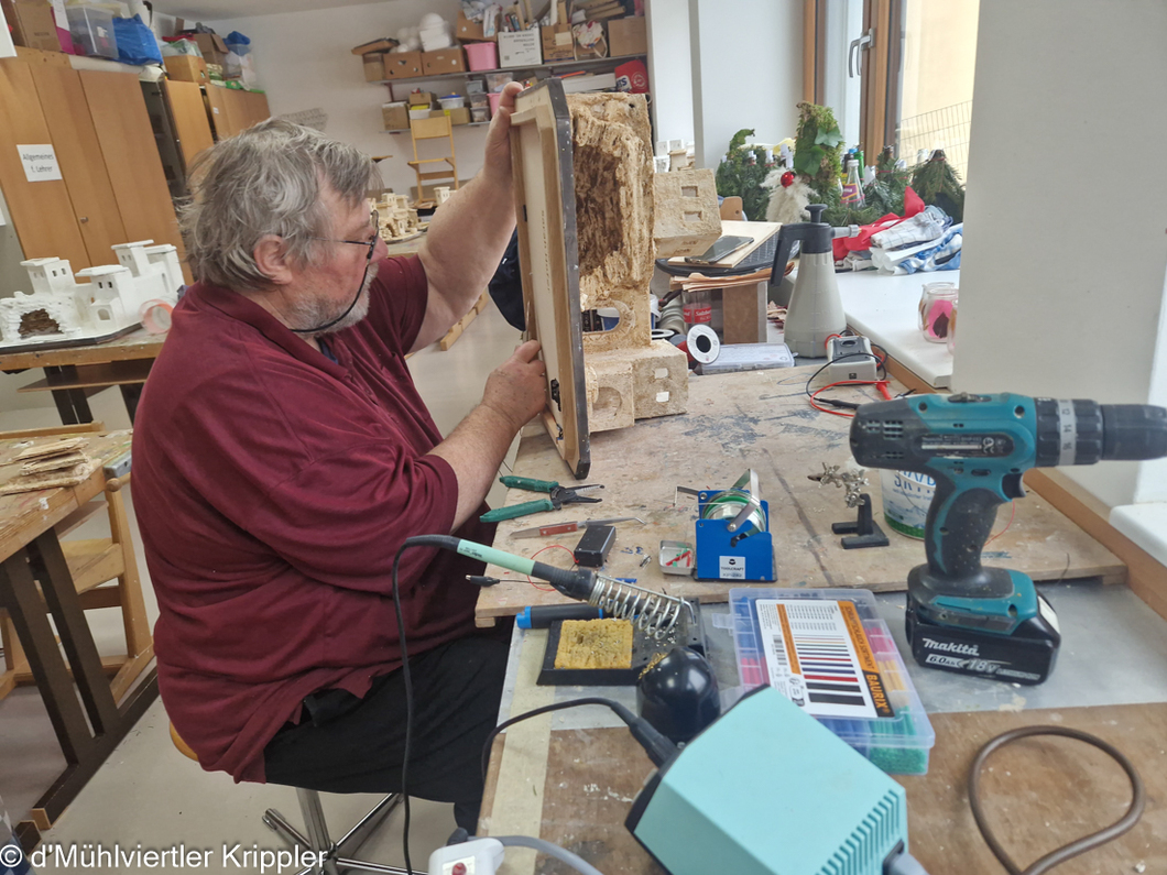Für 23 Krippen wird die Beleuchtung angebracht. Ausgerüstet mit LEDs, Batteriekasten und Kabeln … sind wir, d'Mühlviertler Krippler, derzeit in der Volksschule, um die Orientalischen Krippen, die wir mit den Volksschülern bauen, zu beleuchten. Das Licht schafft Tiefe und Atmosphäre im Stall und im Turm.